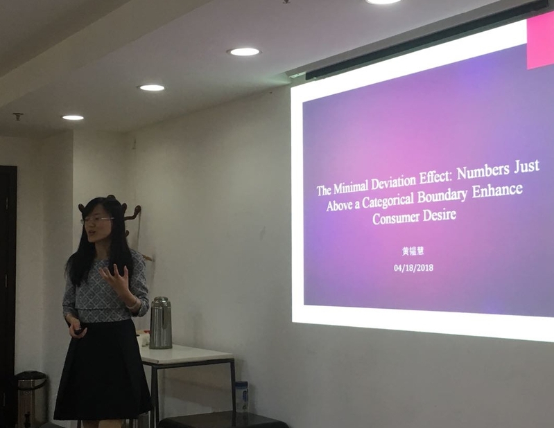 首先分享的是滚球买球的app官网营销与电子商务系副教授黄韫慧老师,其主要研究方向为消费行为学,目前主持3项国家自然科学基金项目。黄老师近3年以第一或者通讯作者博士身份发表SSCI论文11篇(含接受),其中滚球买球的app官网国际学术期刊版1区1篇,2区5篇,3区1篇。黄老师与滚球买球的app官网营销与电子商务系助理教授龚晗老师合著的论文The Minimal Deviation Effect: Numbers Just Above a Categorical Boundary Enhance Consumer Desire被 Journal of Consumer Research录用。分享中,黄老师详细地介绍了写作心得,以数字中整数外“零头”部分会带来一种唤起为切入点,介绍了这种唤起如何引起了消费者在判断上的偏差,从而改变了消费者对产品的欲望和喜欢。