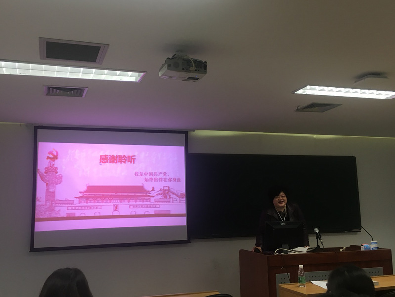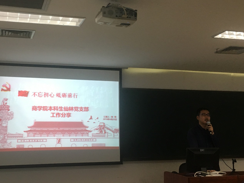 随后,本科生仙林党支部的蒋伟老师进行了党建工作的经验分享。蒋老师首先介绍了学生党支部的主要职责,指出了学生党支部与其他类型党支部的不同之处,然后结合了支部工作的实际,具体向大家介绍如何落实。本科生仙林党支部开创性设置四个职能型的党小组,即党员发展党小组、党员服务党小组、学“习”小组、新媒体党小组。其中,党员发展党小组主要负责积极分子考核打分的细化,对参与党支部活动的情况进行统计,对思想汇报和联系人谈话的质量进行评分,并对思想汇报进行主题设置,在党内推优时交出每一位积极分子的一份成绩单。党员服务党小组以 “项目制”的形式,拓展可以开展的党员活动,发挥学生党员的先锋作用,比如建立党员先锋岗(主要是请高年级党员给低年级党员进行答疑解惑)、开展采访老教授等活动。学“习”小组负责定期整理和发布平时的学习材料,比如寒假布置 “五个一工程”学习任务、学习分享活动。新媒体党小组主要依托“南商青年”公众微信号,定期发布支部活动新闻稿和优秀的思想汇报工作、学习心得等。最后,蒋老师总结了自己多年党建工作的心得和体会。
