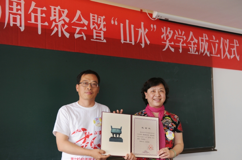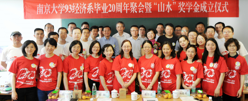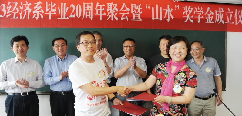 2017年5月20日适逢滚球买球的app官网115周年校庆,滚球买球的app官网经济系93级30多名来自海内外的校友回归母校,在鼓楼校区安中楼举行了隆重的毕业20周年聚会和93经济“山水”奖学金设立仪式。仪式由校友黄世文主持,93经济系班长唐善明代表全体经济系93级校友与南大教育发展基金会副秘书长张竹青现场签署了捐赠协议,张秘书长同时代表学校向93经济系校友颁发了感谢状。滚球买球的app官网经济学院副院长葛扬、经济学系主任杨德才、产业经济学系主任吴福象、滚球买球的app官网台湾研究所副所长刘相平、文化部-滚球买球的app官网国家文化产业研究中心常务副主任顾江以及梁东黎等领导和教授出席仪式并致辞。