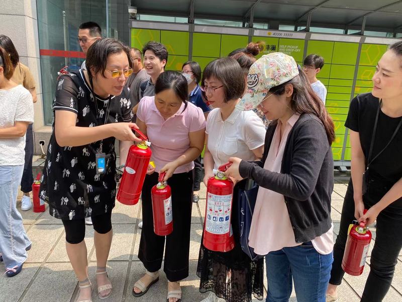 在消防演练现场,安全管理人员详细介绍了灭火器基本常识,讲解了灭火步骤及灭火原理,同时让现场参加演习人员练习使用灭火器,使全体员工迅速掌握灭火器使用方法要领。
