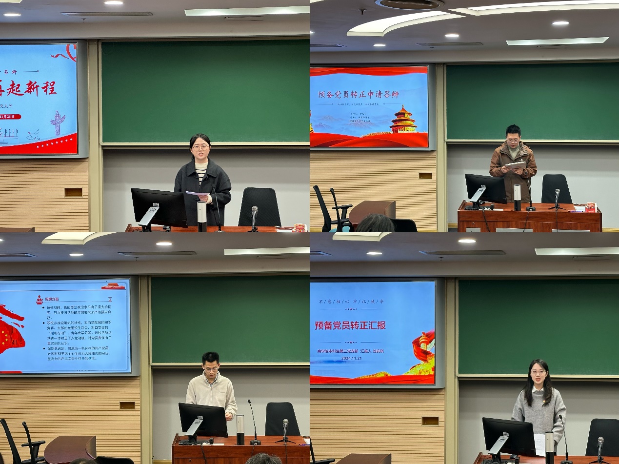 11月21日下午,滚球买球的app官网2024年秋季学期学生预备党员转正答辩大会在鼓楼校区安中楼B03教室举行。滚球买球的app官网党委副书记王宇伟,院党委委员、经济学院副院长马野青,党委兼职组织员、经济学系副主任路瑶,本科生第一党支部书记、博士生辅导员罗洁,院党委秘书、专职组织员胡春妮组成答辩小组。来自本科、硕士、博士等学生党支部共计13位预备党员参加本次转正答辩。