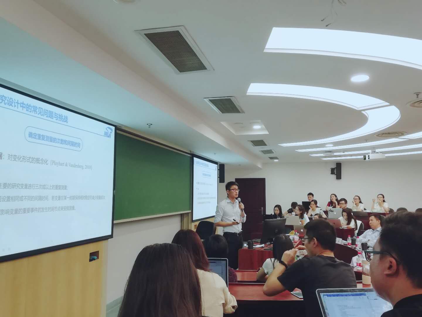 首先,来自华中科技大学的王海江副教授作了题为“人力资源管理研究中的纵向研究设计与数据分析”的主题报告。王老师主要介绍了趋势研究、世代研究和面板研究等三种纵向研究的基本方法;接着指出纵向研究常见的问题和挑战,包括如何对变化进行概念化、如何确定重复测量的次数和间隔时间、如何确定调查样本、纵向测量等同性等一系列问题;最后讲解了四种纵向研究的数据分析方法及未来研究展望,包括随机系数模型、潜在增长模型、交叉滞后模型和潜变计分模型等。
