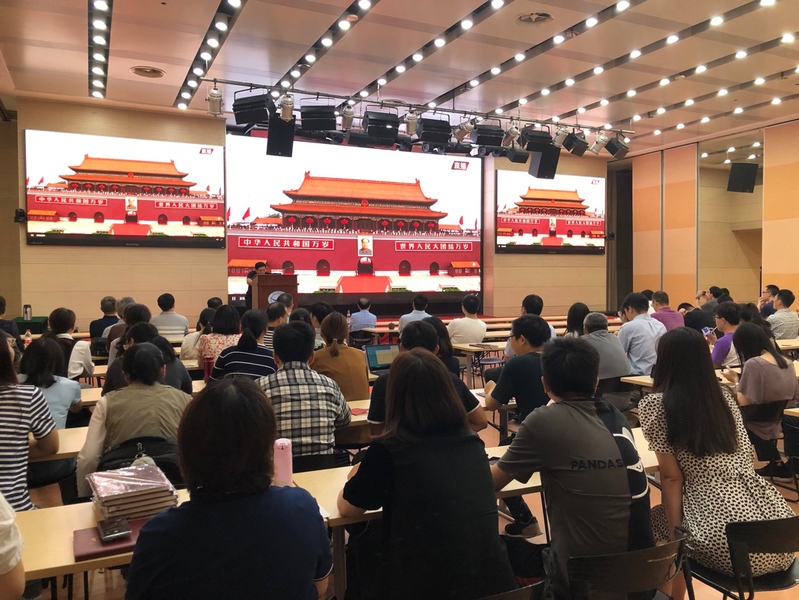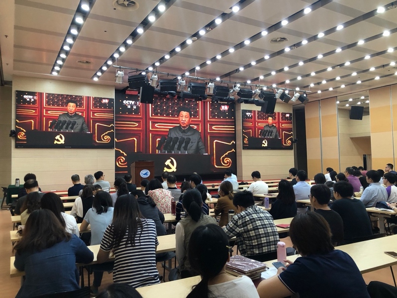 上午,随着直播画面转到天安门广场,大礼堂内顿时安静,大家都聚精会神盯着屏幕。当习近平主席和一众领导班子缓步登上天安门城楼时,礼堂内轻轻地响起了一声“哇”。整场庆典,礼堂内两次全体起立,高唱《义勇军进行曲》和《国际歌》,感情饱满,令我深深动容。而每一次不约而同响起的掌声,更是让我深深体会到,作为中国人民对祖国的拳拳之心,作为中国共产党员对党组织的深刻认同感与归属感。中国共产党立志于中华民族千秋伟业,百年恰是风华正茂!在党的领导下,全国各族人民团结一心,必将实现中华民族伟大复兴的中国梦!亲爱的党,百岁生日快乐!