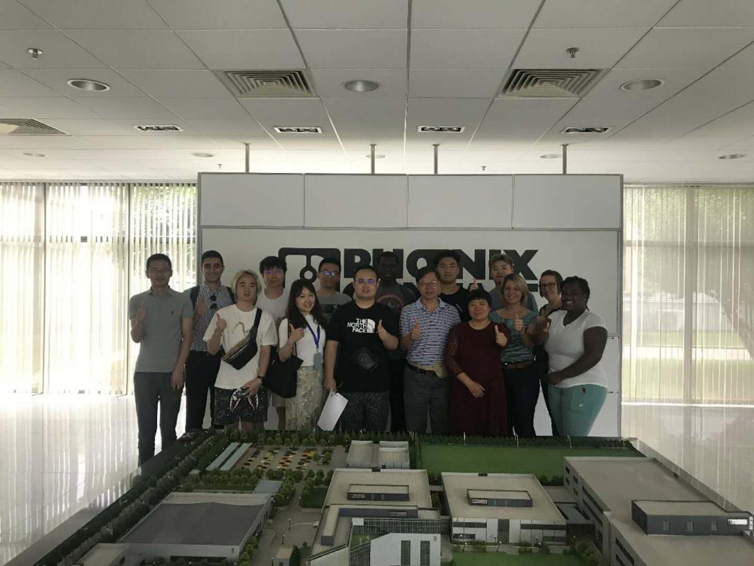 6月8日上午,UMSL的师生对位于南京市江宁区菲尼克斯路36号的菲尼克斯(中国)投资有限公司进行了半天的参观交流活动。该公司副总裁、工会主席缪竞红和经理易书波接待了来访团,易经理带领大家参观了车间,并介绍了公司情况,包括产品种类、组织架构、合作单位和文化墙等,参观结束后缪总与来访师生进行了交流,对大家的问题逐一进行了细致回答,内容涵盖供应链管理、人力资源管理等,以及中美贸易战对公司战略的影响。