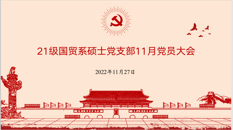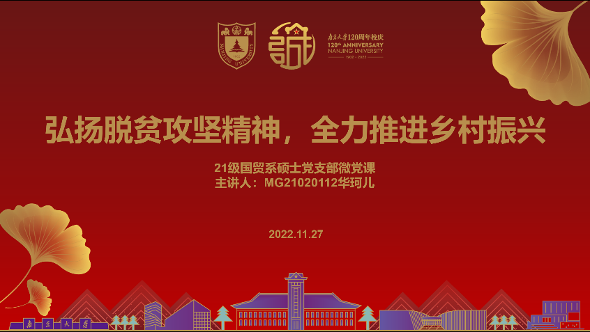 2022年11月27日,滚球买球的app官网21级国贸系硕士党支部2022年第七次党员大会于安中楼106室召开,此次会议由支部书记薛天怡同志主持,线上线下同步进行。会议主要分为“弘扬脱贫攻坚精神,谱写新时代华章”微党课学习和“全面贯彻二十大精神,加快建设‘第一个南大’”大讨论两项议程。