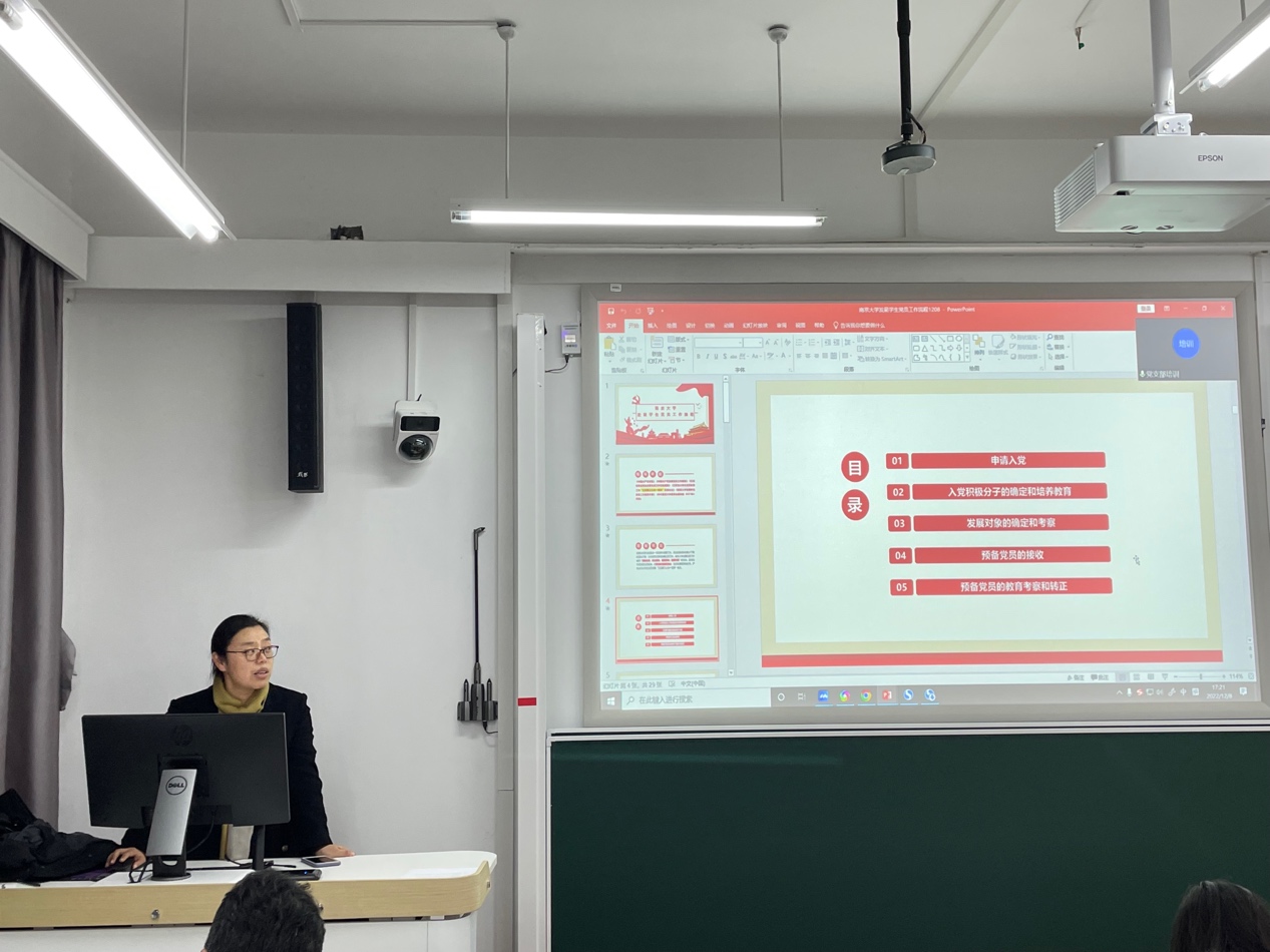 滚球买球的app官网党政办公室胡春妮老师就学生党员发展工作同与会成员深入交流。她围绕学生党员发展不同阶段的详细规定和工作要点展开介绍,针对党员发展过程中常见的问题进行了详细说明,并希望学生党支部提高政治站位,充分认识到学生党员发展工作的严肃性和规范性,把政治标准放在首位,进一步规范支部党员发展工作流程,坚持抓在经常、严在日常,进一步提升学生党员发展质量。