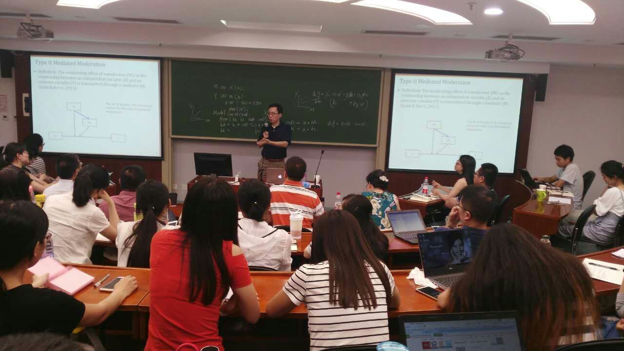 6月20日晚上,张震老师进行了第二次青年学者论坛,主题为“Multilevel SEM”。张震主要向师生们介绍了如何在跨层的研究中使用结构方程模型来进行实证分析。张震老师先从概念模型入手,然后过渡到跨层的结构方程及其检验操作方法。