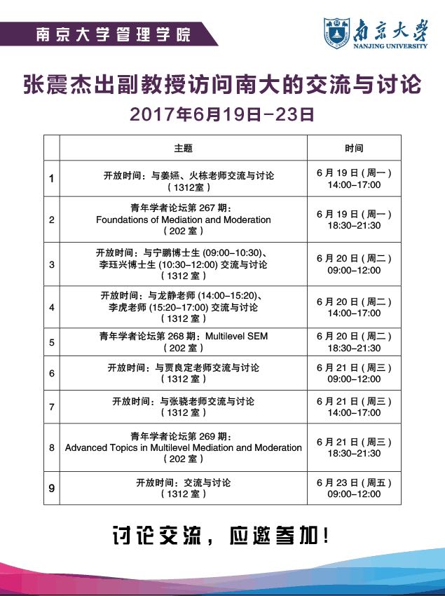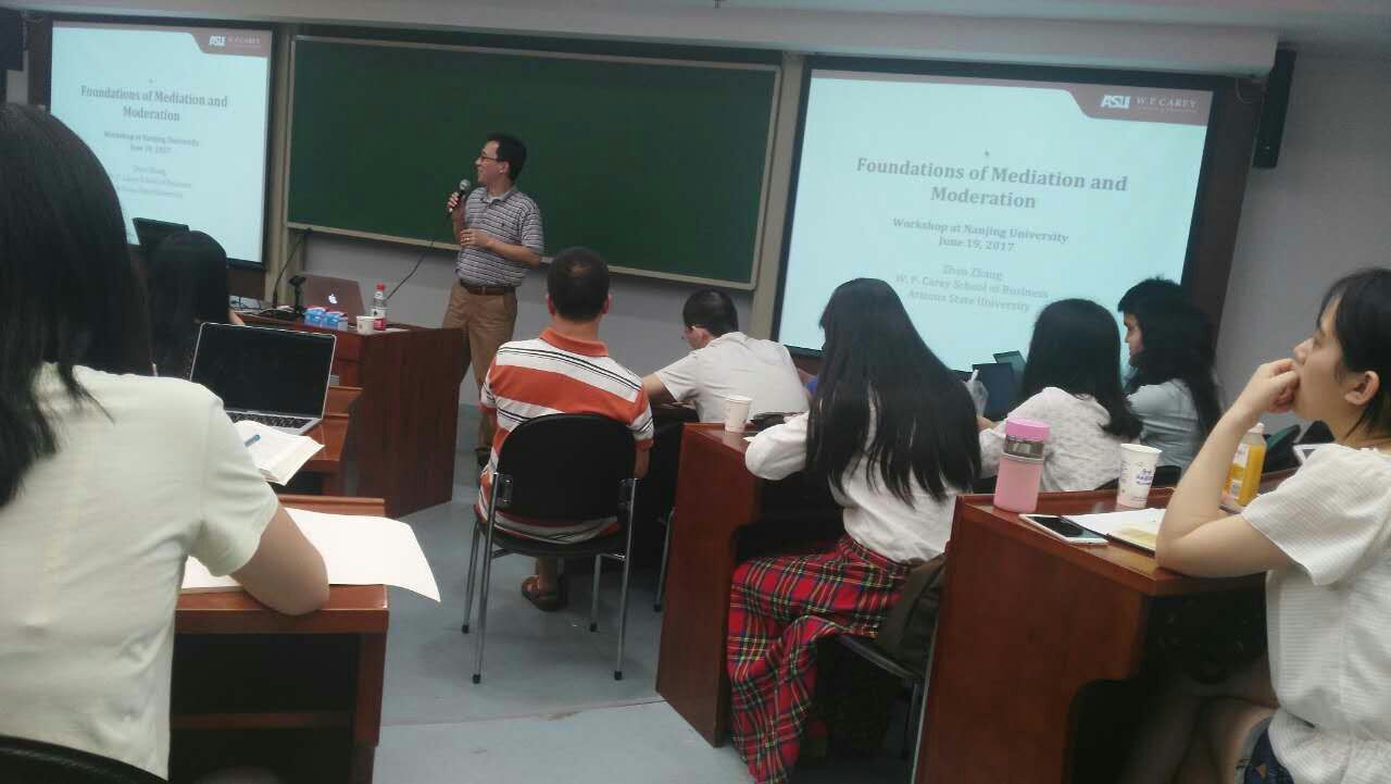 2017年6月19日-23日,亚利桑那州立大学杰出副教授张震博士受工商管理系邀请,来滚球买球的app官网访问交流。张震老师的研究方向包括:领导力开发、团队研究、创业者性格与行为,以及高级定量研究方法。他的研究成果发表于多个国际顶级管理学期刊,并担任这些期刊的编委,包括Academy of Management Journal, Journal of Applied Psychology, Personnel Psychology, Organizational Behavior and Human Decision Processes, Psychological Bulletin, Psychological Methods等。在为期五天的访问交流中,张震老师为来自各地的师生们开展了三场青年学者论坛,向南大师生分享最前沿的定量研究方法。三次论坛均由贾良定教授主持。
