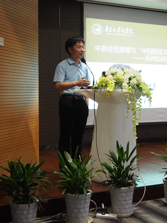 随后,韩教授开始了他的精彩分享。韩教授提出,中美贸易摩擦主要争论的焦点在于,美国认为“中国制造2025”已经威胁到了美国的产业创新;美国针对“中国制造2025” 正式对中国涉及301产品征税,江苏特别是苏州成为高新技术产品出口贸易和利用外资的重灾区;中美贸易战给中国带来的不仅仅只有危机,也会是新的发展机遇。