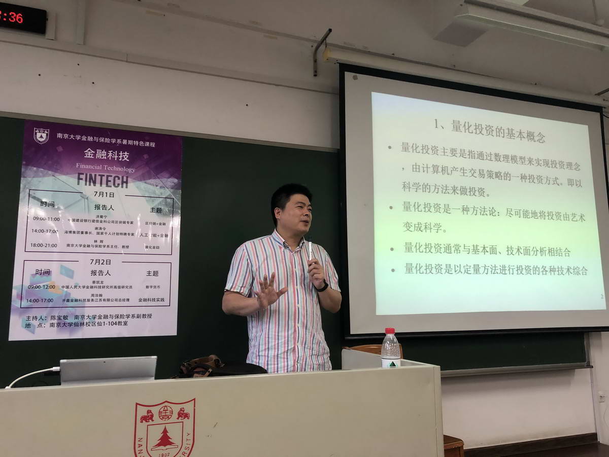 7月1日晚第三讲,金融与保险学系主任林辉教授主讲量化金融。林老师首先介绍了量化分析技术在金融领域的应用,然后讲解了量化投资的基本概念和基本操作,使同学们对量化交易有了直观的认识。随后展示了自己设计的股票分析的程序,辅以对各类指标、数据的选取和处理,让同学们深感量化交易的强大,激发进一步学习的兴趣。