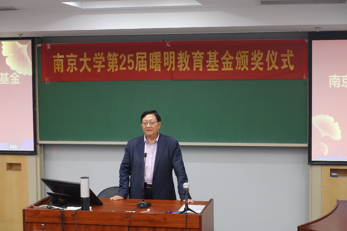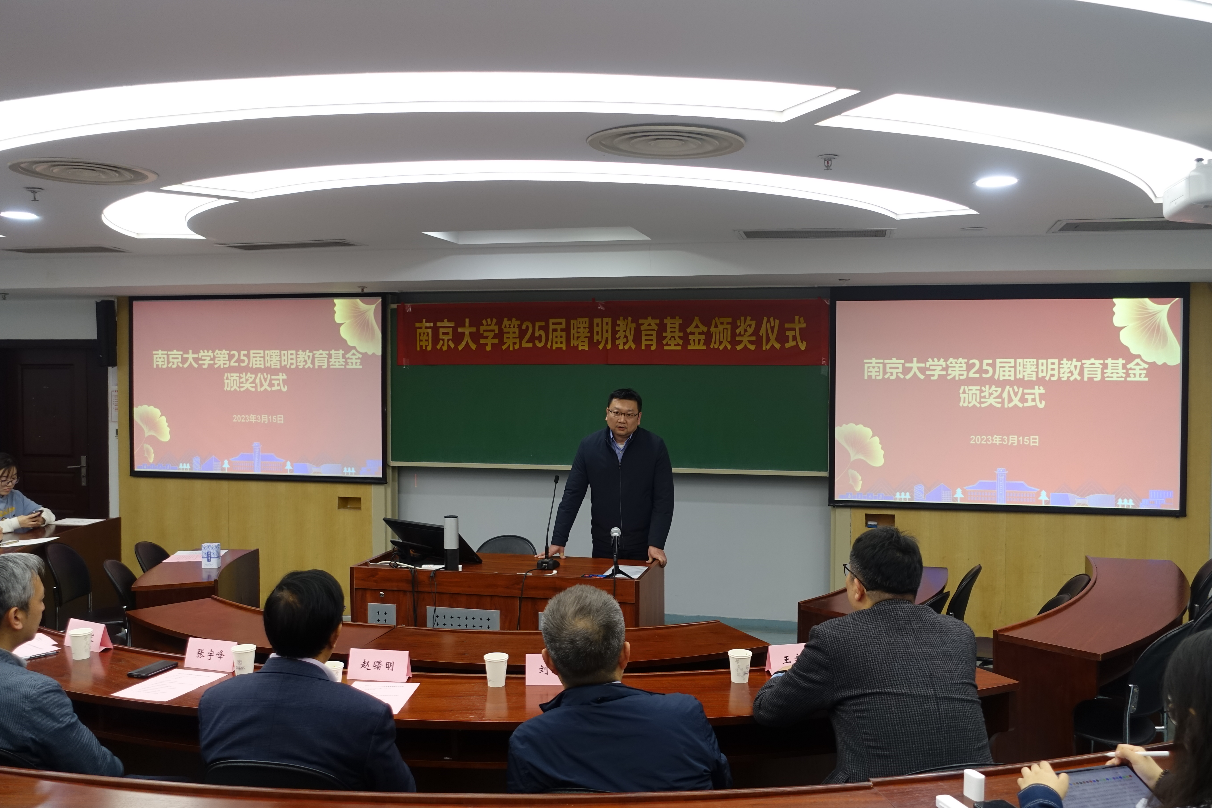贾良定介绍了曙明教育基金设立者赵曙明的个人经历以及曙明教育基金的设立情况,宣读《关于颁发2022年度曙明奖学金、奖管金、奖教金的决定》。赵曙明为获奖师生颁发证书。