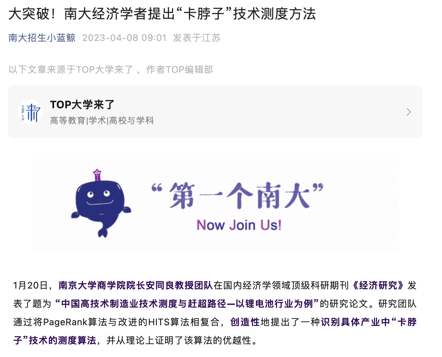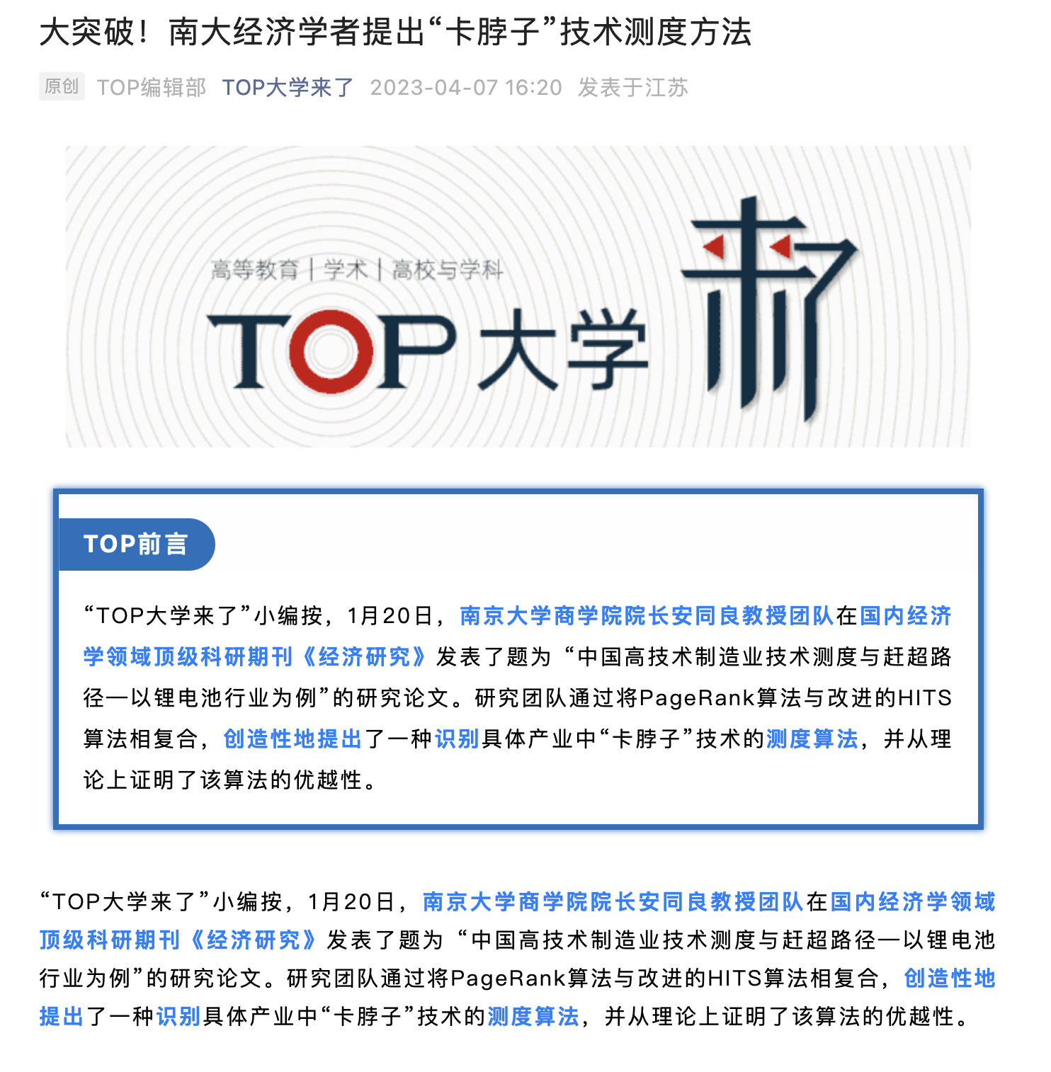 滚球买球的app官网院长安同良教授团队在《经济研究》2023年第1期发表《中国高技术制造业创新测度与赶超路径——以锂电池行业为例》,该论文从专利引用关系入手,创造性地将PageRank算法与改进的HITS算法相结合,提出了一个同时考察技术影响力和企业创新影响力的复合测度“卡脖子”技术与技术赶超的方法,并利用无标度网络的特性,展示了该算法较一般算法能更有效地对技术影响力进行识别与测度。该文以中国锂电池行业为例,发现中国在锂电池领域通过全产业链的协同自主创新,实现了“全产业链赶超”。文章的结论为中国高技术制造业未来的技术赶超及突破“卡脖子”技术提供了靶向性启示,并凝练出技术追赶的“中国式创新”模式。
