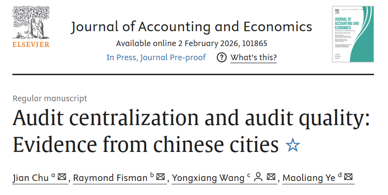 滚球买球的app官网会计学系在中国会计财务领域研究上连续取得重要进展。会计学系褚剑副教授与合作者的文章《Audit centralization and audit quality: Evidence from Chinese cities》于2026年1月在会计学国际顶级期刊Journal of Accounting and Economics接收发表,这是其2025年在会计学国际顶刊Review of Accounting Studies发表中国问题研究后又取得的新突破。