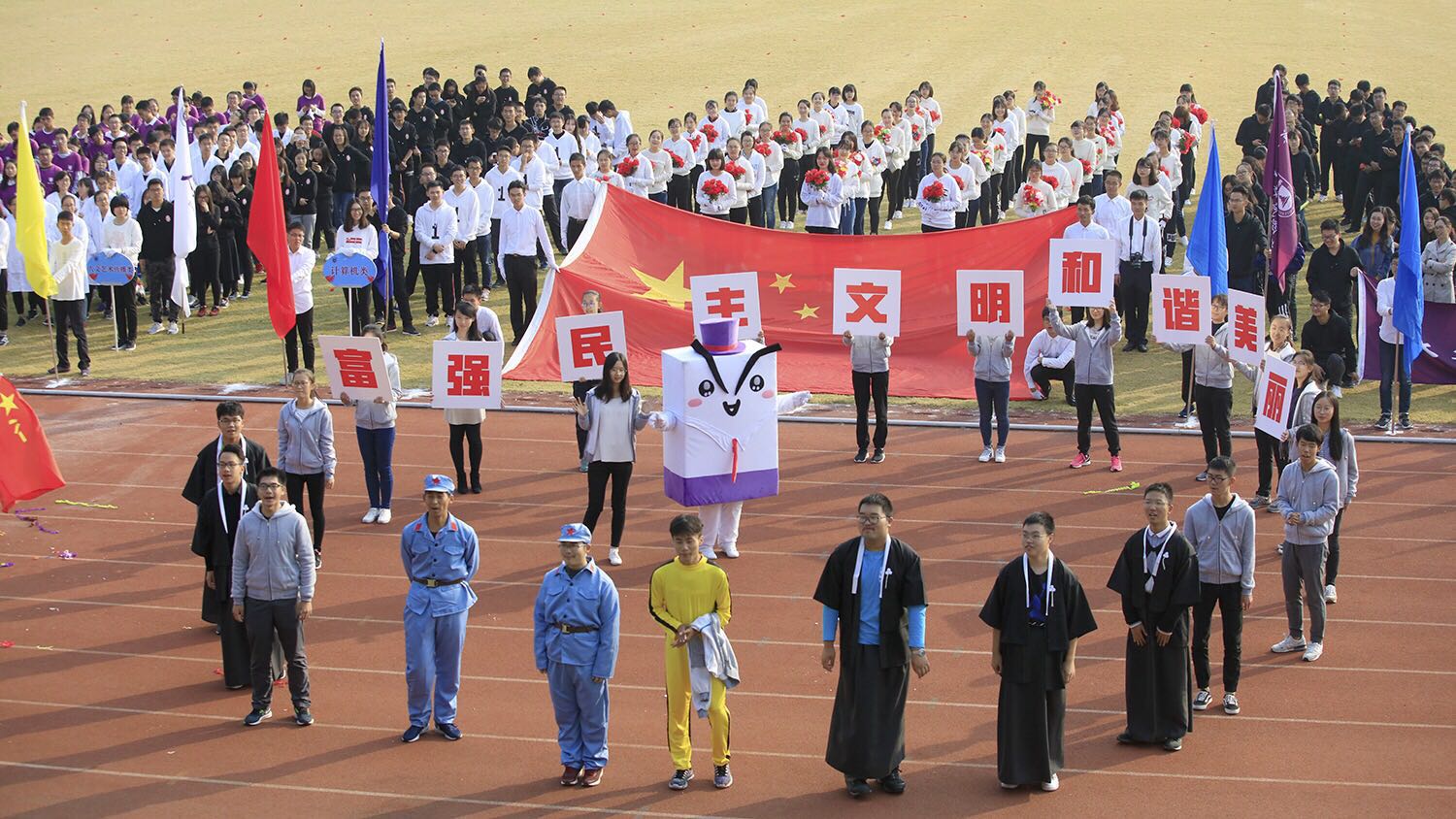 11月3日上午,空气中还夹杂着些许凉意。伴随着嘹亮的进场乐,滚球买球的app官网运动员代表们步履矫健,神采奕奕地向主席台迈进。进行开幕式表演的同学们站在商小宝两侧,他们用自己的表演展现了中国由落后走向富强的艰辛之路。随着写有“东亚病夫”的泡沫板被陈真同学一脚踢碎,中华民族的屈辱史就此终结。随后,两名红军战士挥动着红色旗帜放声高喊:“革命胜利啦”,这象征着中华民族走向了伟大的复兴。最后,同学们高举标有“富强民主文明和谐美丽”的道具板,齐声高喊:“富强民主文明和谐美丽”!进场表演在一片欢呼中圆满结束。