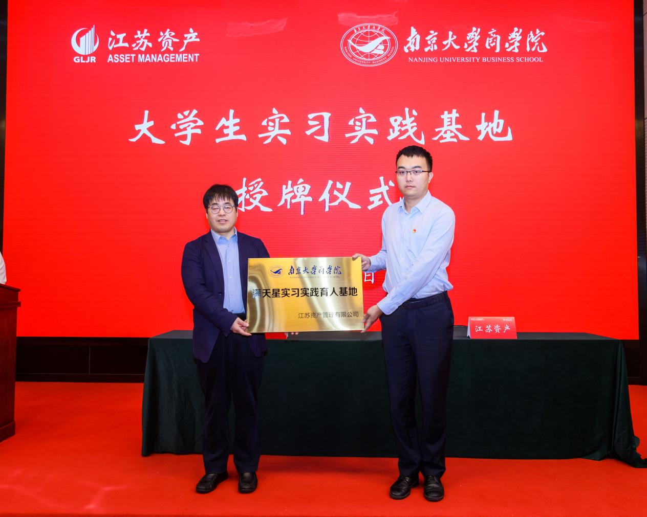 滚球买球的app官网副院长、管理学院院长王全胜和江苏资产党委副书记、总经理赵俊为滚球买球的app官网“大学生实习实践基地”授牌。