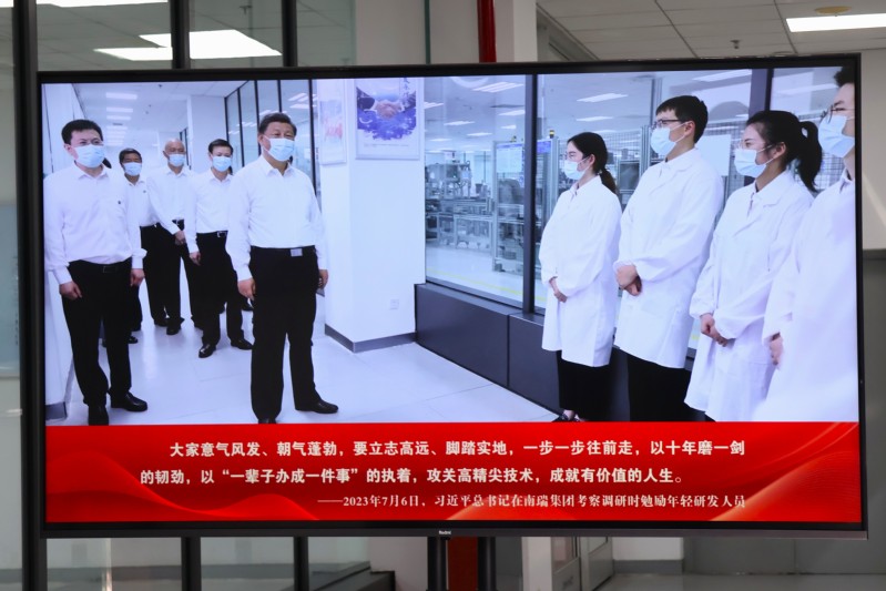 随后,同志们前往参观南瑞集团的智能制造生产区。智能制造生产区配备了先进的生产设备和科学规划的板件生产线,作为南瑞集团电网核心关键产品的制造单位,这里承担着自主可控的自动化产品生产任务。习近平总书记调研南瑞集团时,在这里勉励青年研发人员“以十年磨一剑的韧劲,以‘一辈子办成一件事’的执着,攻关高精尖技术,成就有价值的人生” 。同志们观看总书记调研视频,聆听殷殷嘱托,备受鼓舞。