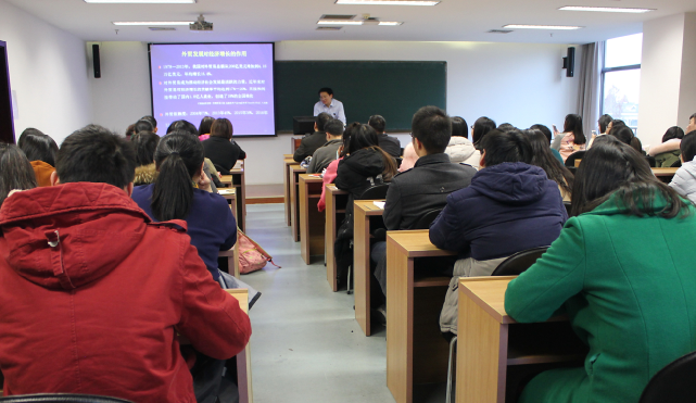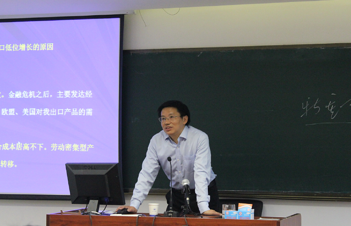 讲座的第一部分内容是经济全球化与中国开放型经济发展。马野青老师从1978年改革开放我国积极融入经济全球化进程谈起,带领我们回顾了我国参与经济全球化的过程,并分析了90年代以来经济全球化迅速发展的原因,指出其直接原因是商品和要素的国际流动性增强。然后,马老师又向我们介绍了中国外贸的发展。通过对1980年~2016年我国贸易总额、进出口总值和贸易依赖度数据的纵向对比及同比增长率分析,我们不难发现,中国正一步步成为世界上数一数二的贸易体。这种定量的分析使我们对中国的外贸发展过程及成果有了更直观清晰的认识。接着,马老师又分析了外贸对我国经济增长的作用。他指出,以前我们常用外贸对经济增长的贡献率和对经济增长的拉动度两个指标来分析其中影响,所以2009年以来,国内会流行外贸拖累经济增长的说法,但事实上,这两种指标已经过时了,强调出口创新不再是我国的发展重点,所以说,在国内经济下行压力加大的情况下,外贸会对经济增长起到重要的支撑作用。那我国外贸出口低位增长的原因是什么呢?马老师认为有五点原因。一是外部需求持续疲软;二是我国出口产品综合成本居高不下,劳动密集型产品的订单向周边国家和地区转移;三是全球价值链扩展减速,我国利用外资减少,外资投资对出口的贡献减弱;四是金融危机以来,欧美主要经济体贸易保护主义盛行;五是外资规模基本稳定。