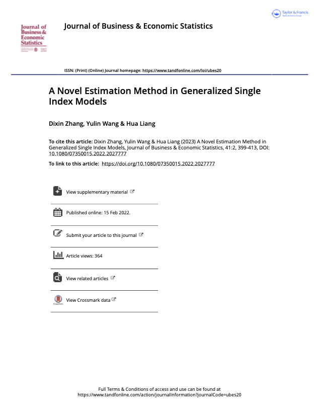 近日滚球买球的app官网退休教授张涤新老师在Journal of Business & Economic Statistics发表论文,题目是A Novel Estimation Method in Generalized Single Index Models。Journal of Business & Economic Statistics是数学和统计学国际顶级期刊。张涤新老师退休之后,仍然坚持进行学术研究,继续为学科建设贡献力量,研究探索始终在路上,学术追求永不停步的精神,值得广大科研工作者学习借鉴。