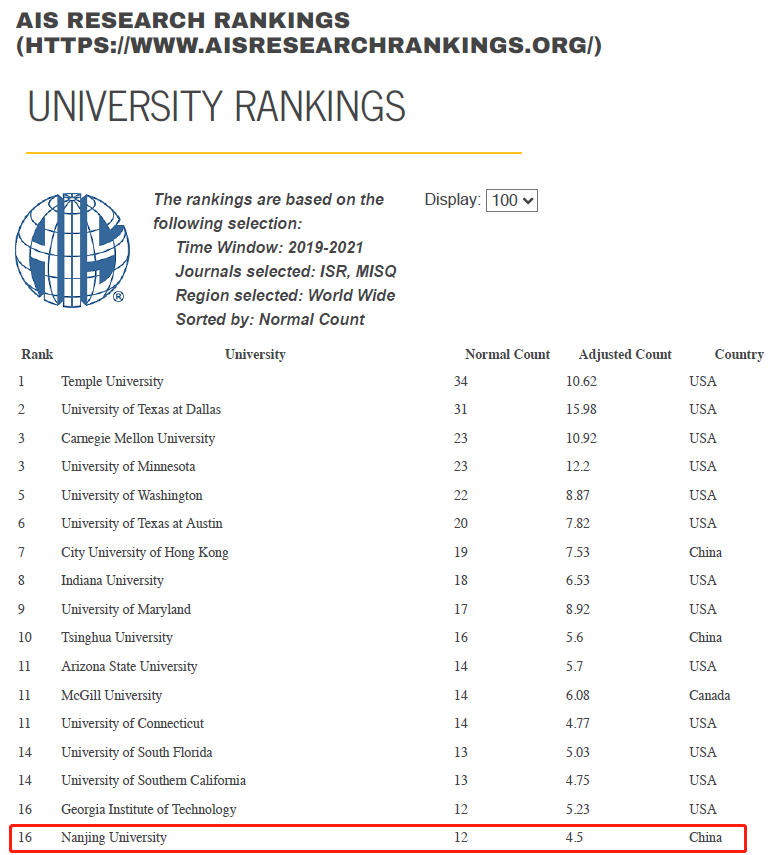 根据国际信息系统学会(AIS)官方统计数据,2019年到2021年在信息系统与电子商务领域两本国际顶尖期刊MIS Quarterly和Information Systems Research发表论文的国际排名中,滚球买球的app官网排名全球第16位。此次排名的提升标志着学院向世界一流滚球买球的app官网迈出了坚实的步伐。