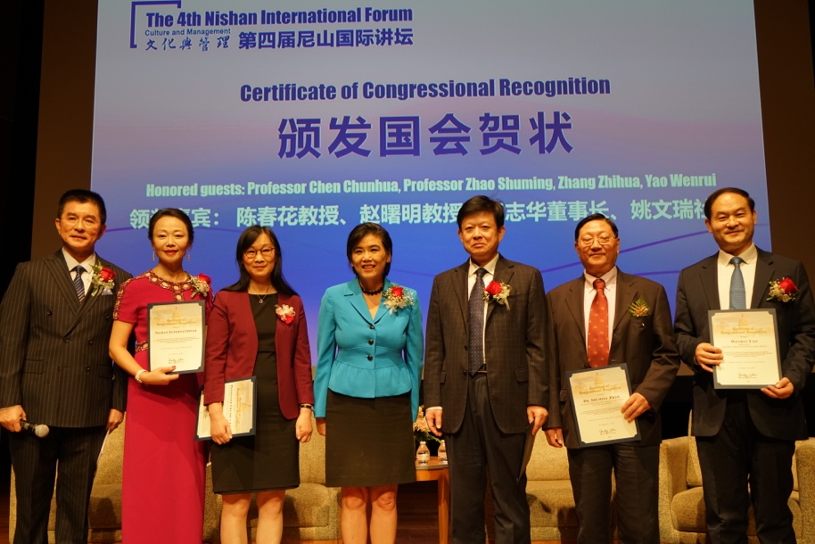 赵美心女士还为此次讲坛作出积极贡献的北京大学国家发展研究院BiMBA滚球买球的app官网院长陈春花教授、滚球买球的app官网名誉院长赵曙明教授、山东出版集团有限公司董事长张志华、山东友谊出版社社长姚文瑞、尼山书屋国际出版公司(美国)总经理乌兰颁发美国国会贺状。