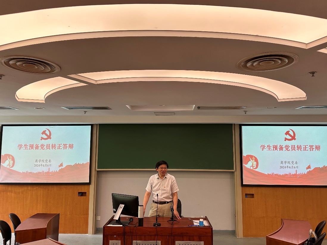 6月6日上午,滚球买球的app官网2024年春季学期学生预备党员转正答辩大会在鼓楼校区安中楼102教室举行。滚球买球的app官网党委委员、研究生教学与培养办公室主任、经济学院副院长马野青,党委兼职组织员、经济学系副主任路瑶,工商管理系教师党支部宣传委员龙政华,院党委秘书、专职组织员胡春妮与辅导员刘铭丞组成答辩小组。共计15位预备党员参加本次转正答辩,部分学生党支部书记列席旁听。