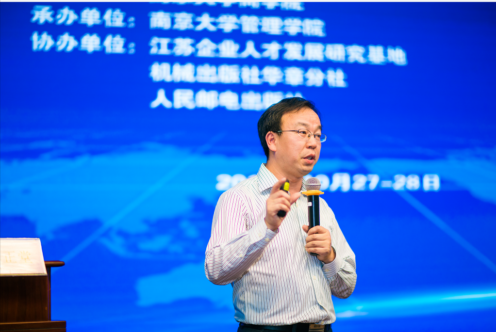 随后,中国人民大学劳动人事学院教授兼博导、华夏基石管理咨询集团董事长彭剑锋教授进行了主题为“创新驱动发展与人力资源管理转型升级”的主题演讲。彭剑锋教授首先结合案例,提出了三个基本观点,其一,管理就是实践,人力资源管理理论与实践创新来源于实践又高于实践;其二,人力资源管理既是一门科学又是一门艺术,要确立人力资源管理者的专业自信与灰度思维;其三,人力资源管理者与研究者要成为价值创造者,要有价值地工作和生活,为人才创造价值、为客户创造价值、为企业业务成长创造价值、为社会福祉创造价值。彭教授基于实践与研究,提出了企业人力资源管理创新的几点建议,即企业家的自我超越与创新领导力构建、构建创新驱动的绩效价值导向、打造充满活力和创造力的组织、重构组织与人的关系、以熵减人才管理理论与模型驱动创新人才持续奋斗,从而实现由线性思维到生态思维,由牛顿式思维到量子思维的变革,实现组织与人才的自我创新驱动。