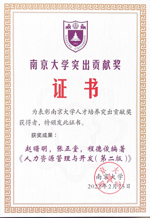 因《人力资源管理与开发(第二版)》在2021年10月12日首届全国教材建设奖评选中获得一等奖,滚球买球的app官网于2月25日授予主要编著者赵曙明、张正堂和程德俊“滚球买球的app官网人才培养突出贡献奖”。