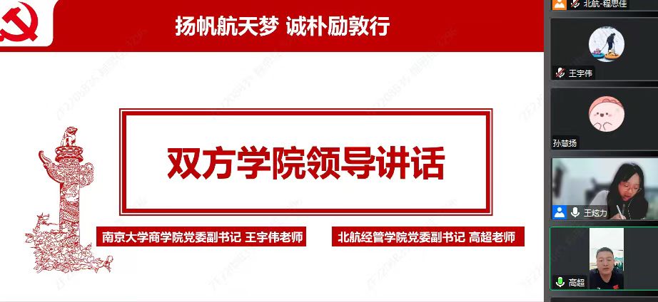 会议开始,双方学院领导作指导发言。王宇伟指出,全党上下正在热学热议习近平新时代中国特色社会主义思想,身为党员要不断提升自己的思想觉悟,做到知行合一,要拓宽学习渠道,加深思考和领悟;希望日后可以将活动从线上延伸到线下,加深两校友谊。