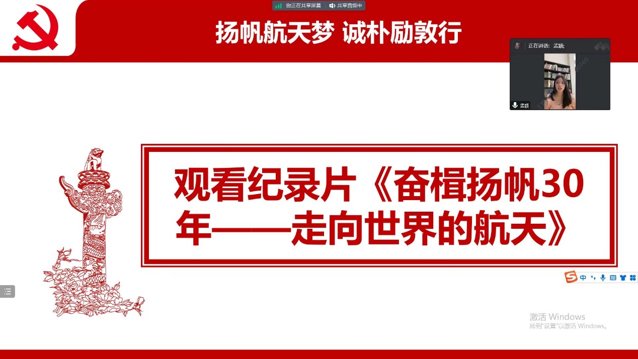 分享结束后,全体成员共同观看纪录片《奋楫扬帆30年——走向世界的航天》并分享感悟。该纪录片展现了我国航空事业在维护国家安全、服务经济社会、提高国际竞争力方面发挥的重要作用。我国载人航天捷报频传,关键在于坚持党的领导。每一次重大突破,无不凝聚着党中央的决策支持和关怀,凝聚着党组织和广大航天系统职工的智慧和力量。中国航天事业取得辉煌成就背后,是党中央把科技自立自强作为国家发展战略支撑的决策部署,指引着航天事业前进的方向。