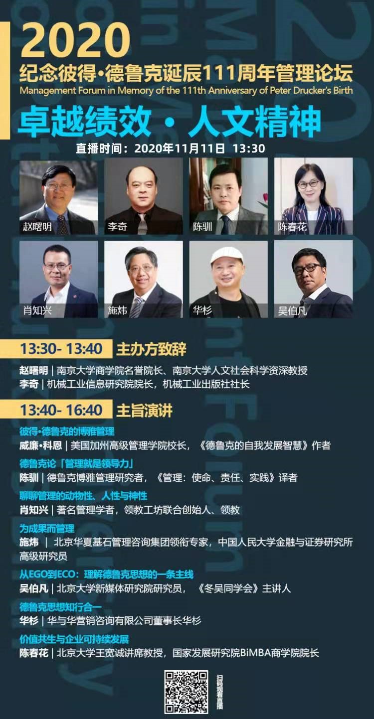 今年是现代管理学之父彼得·德鲁克诞辰111周年。11月11日,机械工业出版社华章公司、滚球买球的app官网、领教工坊共同举办了2020纪念彼得·德鲁克诞辰111周年暨德鲁克管理论坛122期,本次论坛的主题为“卓越绩效,人文精神”。
