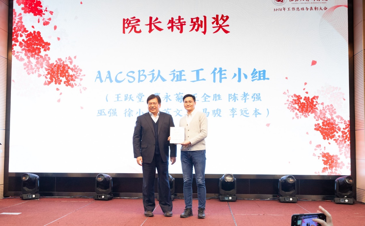 随后,杨忠、薛海林、施建军、赵曙明、李琦、刘志彪等几位老师分别上台致辞,他们纷纷对学院2018年取得的成绩予以了肯定,表达了祝贺,并送上新年祝福。 此外,学院还表彰了2018年在教学、科研等方面取得优秀成果的老师,并授予AACSB认证工作小组院长特别奖。