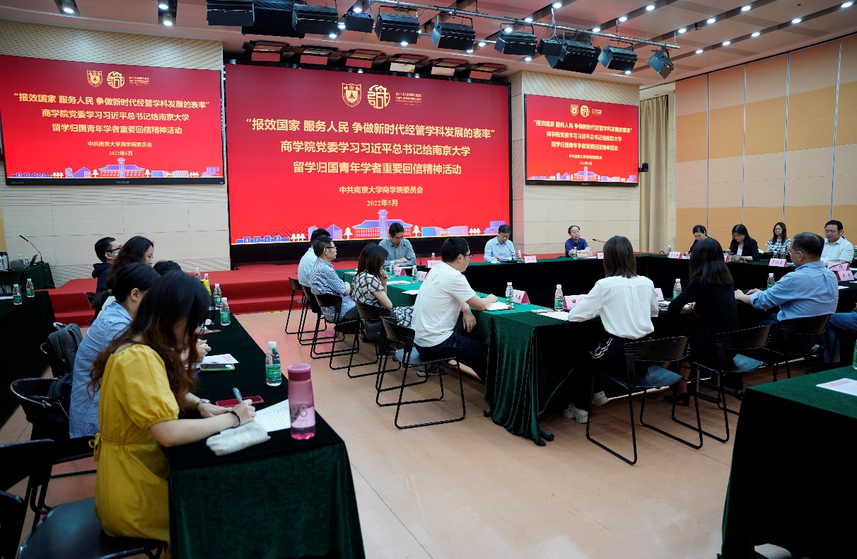 5月27日下午,滚球买球的app官网党委在安中楼鸿意报告厅开展“报效国家 服务人民 争做新时代经管学科发展的表率”学习习近平总书记给滚球买球的app官网留学归国青年学者重要回信精神活动。院党委书记刘洪,院党委副书记、院长安同良出席会议并讲话。全体党支部书记、辅导员代表、教师党员代表和学生党员代表参加会议。院党委副书记王宇伟主持会议。