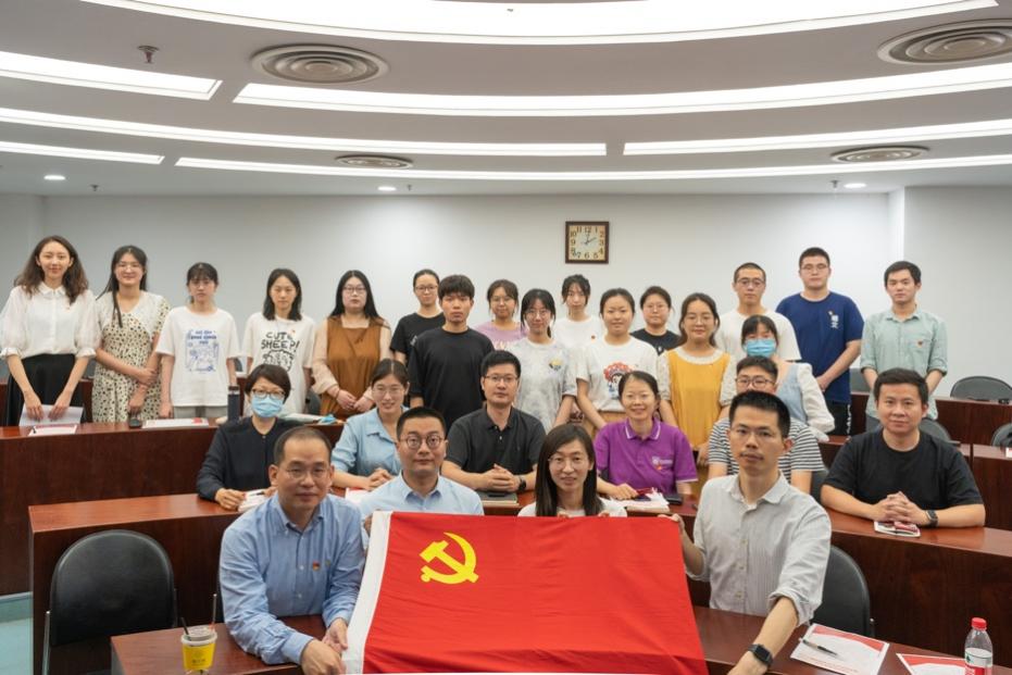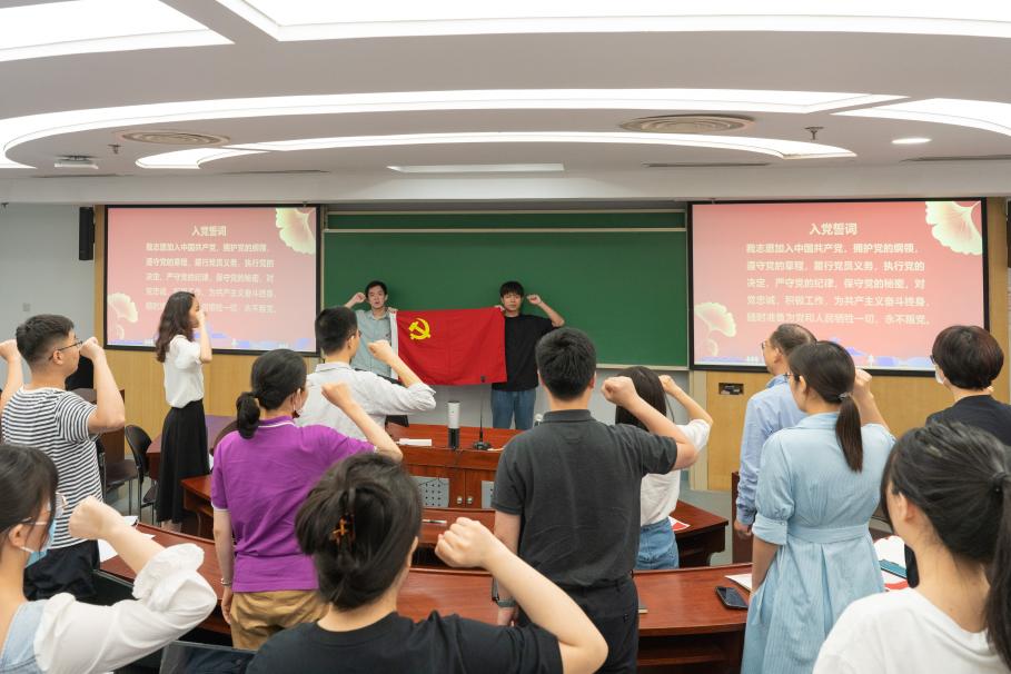 师生交流结束后,21级企管硕士党支部书记熊媛媛同志分享了她学习重要回信精神的感悟。一是回信不仅是对留学归国青年学者的肯定,也是对全体南大青年的鼓励与期望;二是要学习老一辈科学家的精神,为实现中华民族伟大复兴贡献青春和力量;三是要坚定文化自信,讲好中国故事,努力做到把论文写在祖国大地上!在榜样的力量学习部分中,成海燕同志通过一段视频向全体师生介绍程开甲院士的事迹,勉励大家不忘初心、牢记使命。会议最后,全体党员面向党旗,一起重温入党誓词。