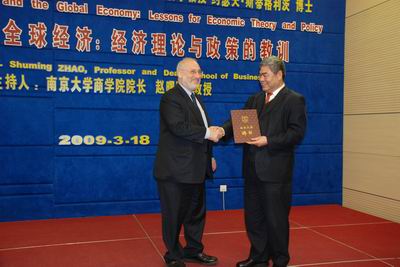 2009年3月18日,美国哥伦比亚大学经济学教授、2001年诺贝尔经济学奖得主约瑟夫•斯蒂格利茨来到滚球买球的app官网访问,受聘为滚球买球的app官网荣誉教授,同时发表题为《经济危机与全球经济:对经济理论和政策的启示》的演讲。斯蒂格利茨教授认为,应对目前的经济危机,必须进行全球合作,在全球范围内建立统一的信贷、协作、监管一整套体系和机构,并使之有效运转。他还对中国的经济刺激计划表示赞赏,中国的一揽子计划非常切实,并且与经济的长期发展目标相协调。