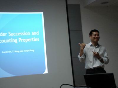 本次讨论会报告人为香港城市大学张田余博士,主题是《Founder Succession and Accounting Properties》,由会计与财务研究院陈冬华教授主持。与会者包括杨雄胜、陈冬华、张朝宓、李翔、张娟、薛清梅、俞欣等会计学教授、会计与财务研究院年轻教师以及一些对学术有兴趣的博士生。
