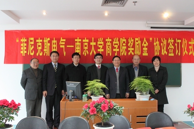 2009年 12月16日下午14:30,“菲尼克斯电气——南大滚球买球的app官网奖励金”协议签订仪式在滚球买球的app官网安中楼610教室隆重举行。南京菲尼克斯电气有限公司总经理顾建党先生、人力资源经理马如明先生、滚球买球的app官网院院长赵曙明教授、副院长刘洪教授、副院长曹永菊老师等出席了签订仪式。刘洪教授主持了仪式。