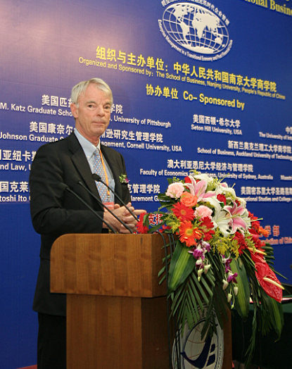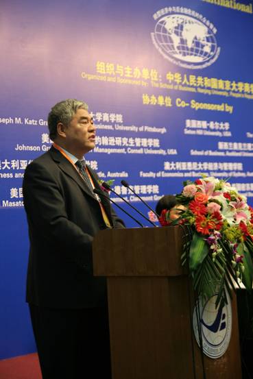 6月5日,本次国际研讨会开幕式隆重开幕,第七届企业跨国经营国际研讨会大会主席、滚球买球的app官网院长赵曙明教授主持开幕式并致欢迎词。滚球买球的app官网党委书记洪银兴教授、2001诺贝尔经济学得主、世界银行发展中国家经济发展委员会主席、斯坦福大学教授迈克尔?斯班塞(Michael Spence)博士、美国密苏里—圣路易斯大学副校长兼国际研究中心主任Joel Glassman教授、对外经济贸易大学校长施建军教授、美国克莱蒙特大学彼得?德鲁克管理学院Jean Lipman-Blumen教授、美国匹兹堡大学管理学院院长John T. Delaney教授、澳大利亚纽卡斯尔大学副校长兼商务与法律学院院长Stephen Nicholas博士、荷兰马斯特里赫特管理学院院长Peter P. de Gijsel教授、澳大利亚悉尼大学经济与管理学副院长、教授John Shields博士和新西兰奥克兰理工大学商务与法律院长Geoff Perry博士在主席台就坐。
