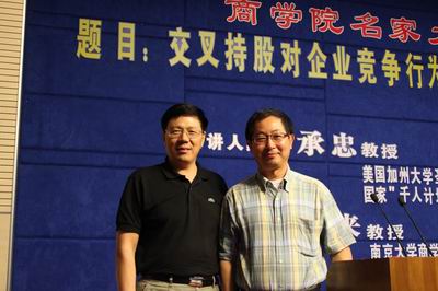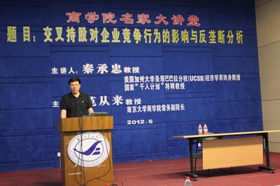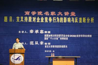 2012年6月13日下午,滚球买球的app官网名家大讲堂在安中楼二楼报告厅举行。本次活动的演讲主题是“交叉持股对企业竞争行为的影响与反垄断分析”。主讲人为美国加州大学圣塔巴巴拉分校(UCSB)经济学系终身教授、国家“ ”特聘教授、山东大学博弈论与经济行为研究中心主任秦承忠教授。滚球买球的app官网常务副院长范从来教授主持了本次活动。