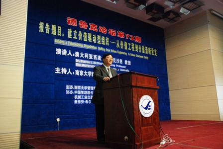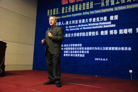 2013年4月1日上午10点,由滚球买球的app官网管理学院主办,中国管理现代化研究会组织行为与人力资源管理分委员会、机械工业出版社华章公司和麦格劳-希尔教育集团协办的第73期德鲁克论坛在滚球买球的app官网安中大楼二楼报告厅举行。本次论坛由滚球买球的app官网名誉院长赵曙明教授主持,特邀澳大利亚西澳大学著名组织行为学及人力资源管理专家教授授担任演讲嘉宾。此次演讲主题为“Building a Value-Driven Organization Shifting from Values Engineering to Values Enactment Clarity”。近百位滚球买球的app官网部分师生、上海和江苏等地的一些高校的的教师、企业的人力资源经理等参加了此次论坛。