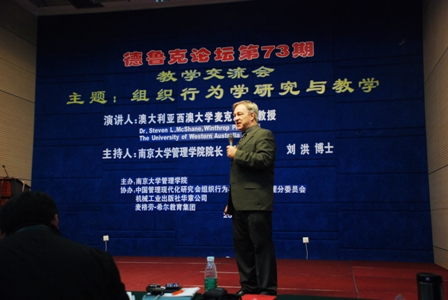 下午2点,论坛由滚球买球的app官网管理学院院长刘洪教授主持, 邀请麦克沙恩教授则针对“如何在‘组织行为学’课程中开展案例教学”、“如何进行小组和大班授课及互动教学”和“基于在线教辅资源平台的互动展示及国外电子教学的趋势”等内容与一些高校教师和研究生进行了研讨和交流。他通过自己“组织行为学”的授课方式来对自己的观点做了示范,并且对价值观、自我概念(Self-concept)、权力的权变因素、工作场所的情绪和社会网络等热门研究内容做了进一步的分析。
