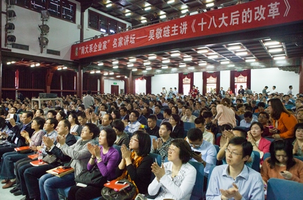本次讲坛由滚球买球的app官网主办,南京新华书店三联出版社协办,滚球买球的app官网EMBA教育中心承办。滚球买球的app官网党委书记洪银兴教授等相关领导出席了本次讲坛。滚球买球的app官网经济学院院长、滚球买球的app官网副院长、教育部长江学者特聘教授沈坤荣教授担任讲坛主持。近千名来自各地的滚球买球的app官网EMBA学生和校友、“南大系”企业家朋友、滚球买球的app官网及其他院系的在读学生、老师、媒体朋友,以及社会各界人士慕名而来,聆听吴教授深度解读十八大后的改革导向和经济风向。