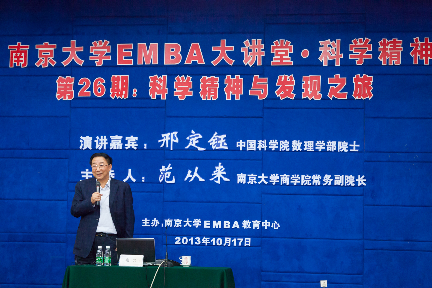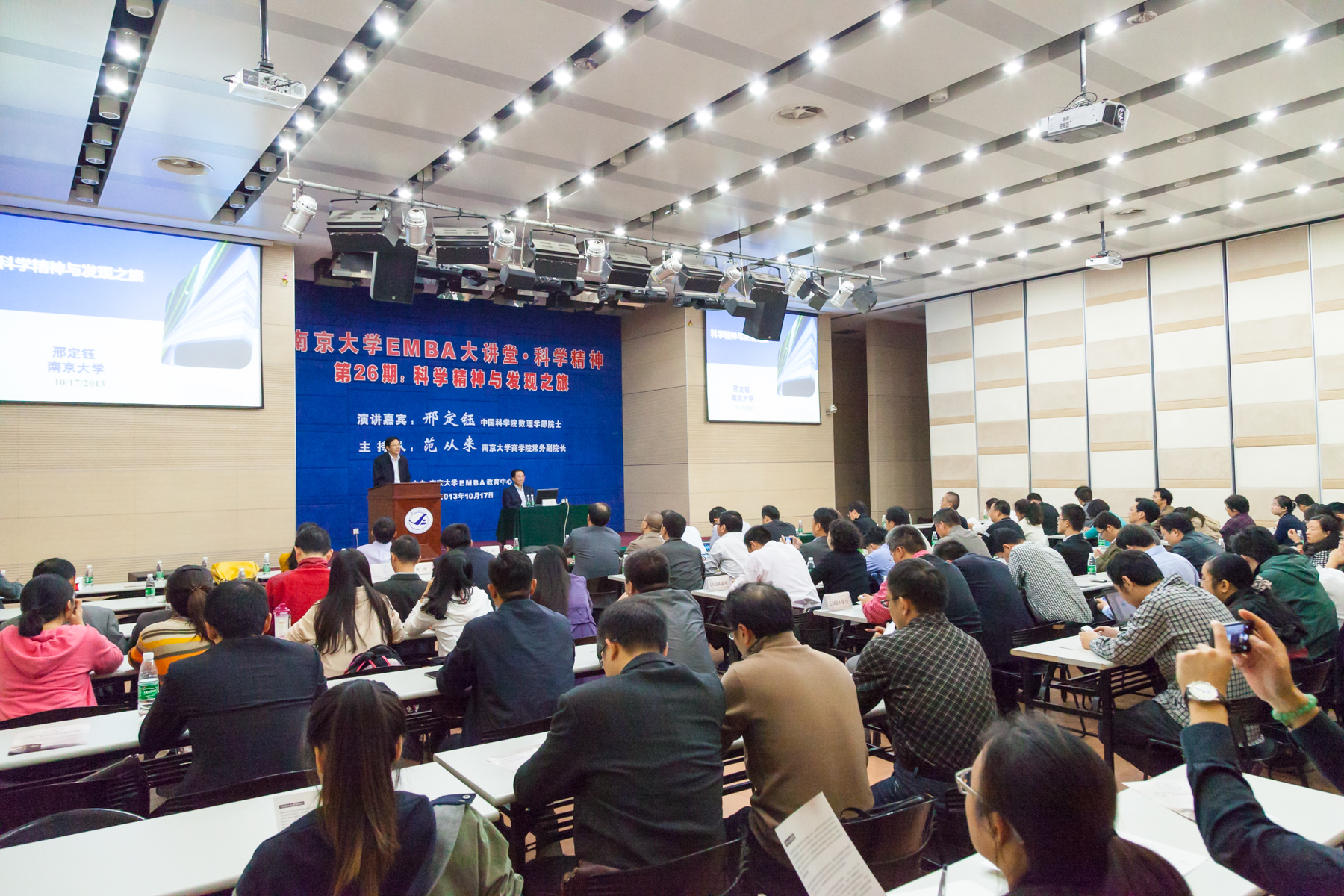 2013年10月17日晚6点,滚球买球的app官网EMBA大讲堂·科学精神(总第26期)在滚球买球的app官网安中楼210报告厅隆重举行。本次EMBA大讲堂荣幸邀请到中国科学院数理学部院士、滚球买球的app官网物理学院邢定钰教授为大家演讲,主题为“科学精神与发现之旅”。主持人为滚球买球的app官网常务副院长范从来教授。