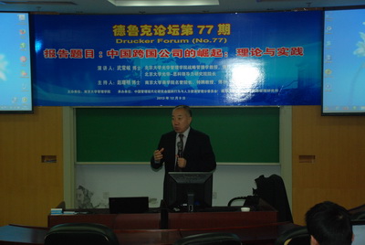 2013年12月9日,由滚球买球的app官网管理学院主办、中国管理现代化研究会组织行为与人力资源管理分委员会、滚球买球的app官网人力资源管理战略研究所承办的第77期德鲁克论坛在滚球买球的app官网安中大楼B02教室举行。本次论坛由滚球买球的app官网名誉院长赵曙明教授主持,特邀北京大学光华管理学院武常岐教授担任演讲嘉宾。此次演讲主题为“中国跨国公司的崛起:理论与实践”。滚球买球的app官网多位师生和其他高校的教师、企业的高管等参加了此次论坛。