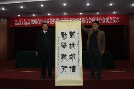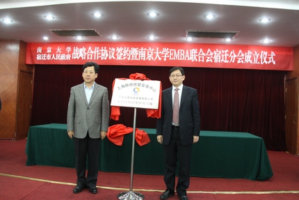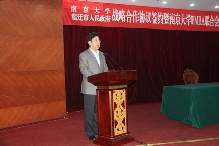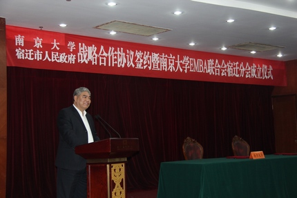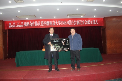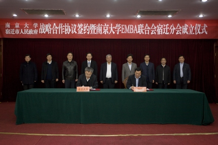 2013年12月1日,滚球买球的app官网与宿迁市人民政府战略合作协议签约暨滚球买球的app官网EMBA联合会宿迁分会成立仪式在宿迁国际饭店中华厅隆重举行。出席仪式的滚球买球的app官网、上海股权托管交易中心的领导和嘉宾有:滚球买球的app官网党委书记洪银兴,副校长吕建,党委常委、党委办公室主任邹亚军,校长助理李成,滚球买球的app官网常务副院长范从来,科技成果转化中心主任张晓东,滚球买球的app官网院长助理韩顺平,EMBA教育中心主任徐宁,EMBA联合会会长钱盘生、王友利,执行会长罗强,秘书长伊道科、曹正佯,上海股权托管交易中心总经理张云峰,总经理助理魏舒明,以及EMBA教育中心的老师。出席仪式的宿迁领导有:宿迁市委副书记、代市长王天琦,常务副市长沈海滨,副市长冯岩,政协副主席华志明,宿迁学院院长闵铁军,市政府秘书长郭金,副秘书长葛翔宇,以及宿迁经济技术开发区、苏宿工业园区、宿迁市软件园、高新区、人才办、发改委、教育局、科技局等单位的领导嘉宾。