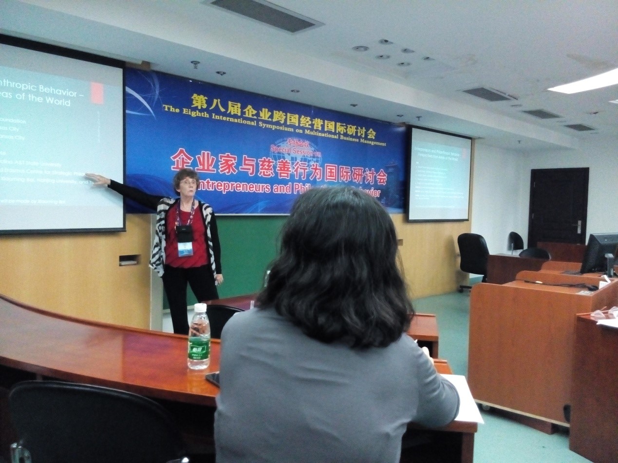 6月12日15:00,由滚球买球的app官网、密苏里大学堪萨斯分校和考夫曼基金会举办的“企业家和慈善论坛”——第八届企业跨国经营国际研讨会专场会议在滚球买球的app官网安中楼302教室举行。滚球买球的app官网名誉院长赵曙明教授、美国密苏里大学圣路易斯分校副校长Joel Glassman教授、美国密苏里大学圣路易斯分校滚球买球的app官网院长Charles Hoffman教授、美国密苏里大学堪萨斯分校亨利•布劳格管理学院戈特布里/密苏里战略管理讲席教授Marilyn Taylor博士、美国非营利考曼夫基金会Robert Strom教授、美国伍斯特理工学院Frank Hoy教授、美国北卡罗莱纳农工州立大学Chi Anyansi-Archibong教授、荷兰鹿特丹伊拉斯姆斯大学和伊拉斯姆斯战略慈善中心Lucas Meijs教授及滚球买球的app官网博士生赵宜萱女士和白晓明先生,以及来自滚球买球的app官网的MBA、EMBA同学参与了本次研讨会。本次专题研讨会由Marilyn Taylor博士主持。