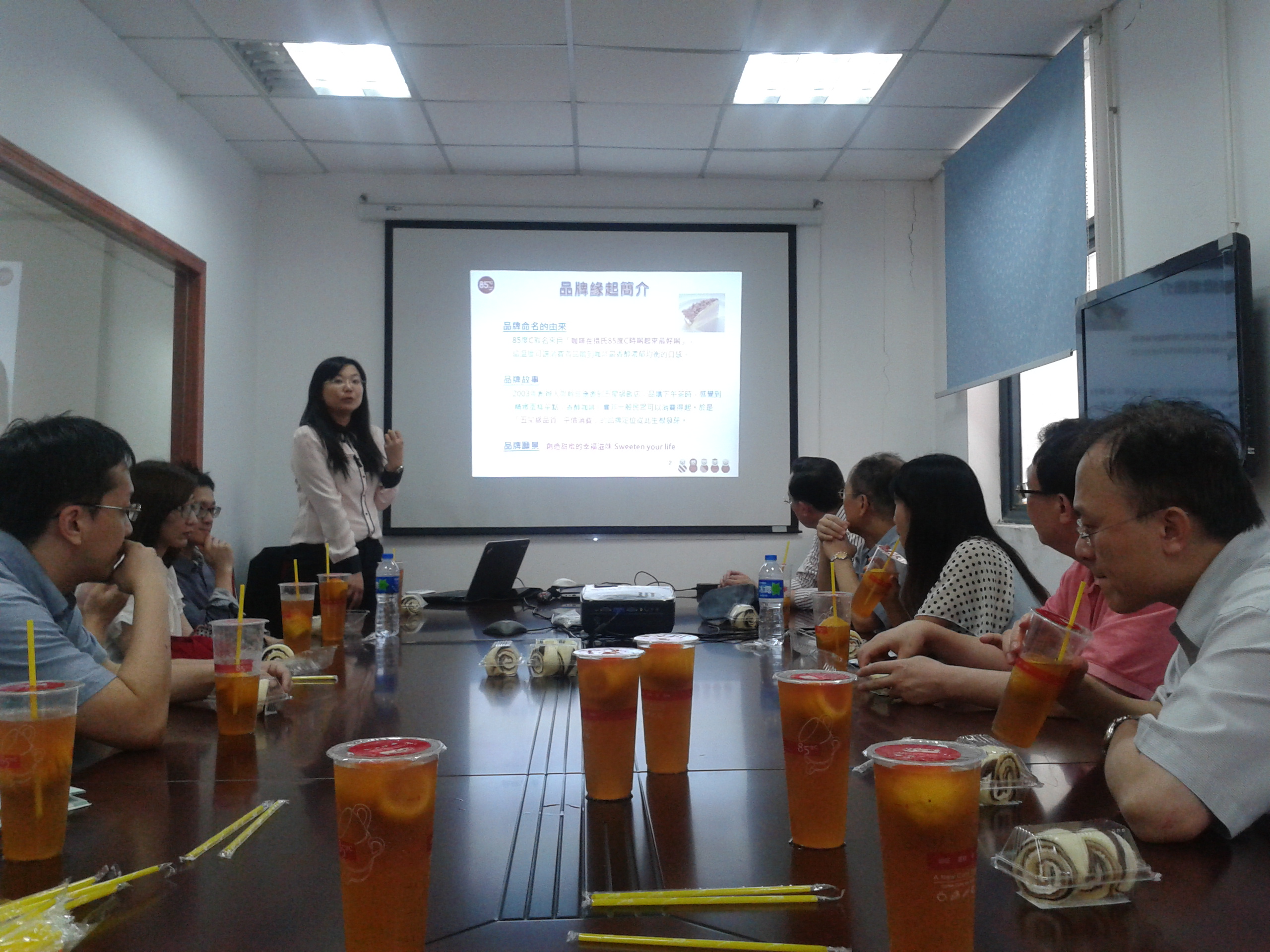 同日下午,在著名餐饮品牌85度C的市场公关经理黄兰英女士的带领下,在史有春教授与杨东涛教授的陪同下,与黄思明教授及台湾政治大学的师生们参观了85度C位于江宁汇众科技产业园的加工工厂——胜品(江苏)食品有限公司。一行人在观摩了原材料从预加工到最终配货的整个流程之后,聆听了黄经理关于85度C品牌形象、产品特色、核心竞争力、货物配送、物流运转以及未来计划的报告。报告完毕后,教授们即围绕其特色产品展开了涉及食品行业诚信问题,如何维护良好客户关系等议题展开了讨论。