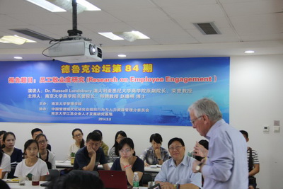 2014年9月8日,由滚球买球的app官网管理学院主办,中国管理现代化研究会组织行为与人力资源管理分委员会、滚球买球的app官网江苏企业人才发展研究基地协办的第84期德鲁克论坛在滚球买球的app官网1312教室举行。本次论坛由滚球买球的app官网名誉院长赵曙明教授主持,特邀澳大利亚悉尼大学滚球买球的app官网原副院长、荣誉教授Russell Landsbury担任演讲嘉宾。此次论坛主题为“员工敬业度研究(Research on Employee management)”,Russell Landsbury教授做了题为“Employee Communication and Engagement: An Elusive Quest?”的报告。尽管正值中秋佳节,但有滚球买球的app官网60多位教授、博士后和博士硕士研究生参加了本次论坛,并有众多外校师生慕名前来,现场火爆程度可见一斑。