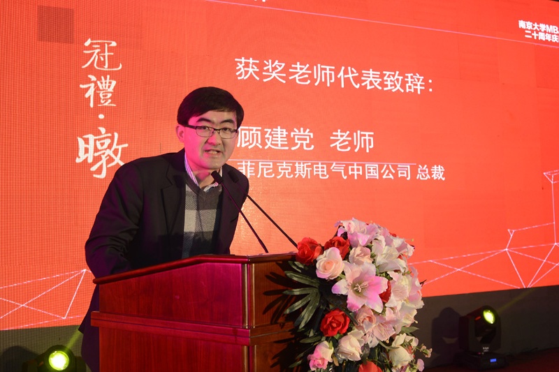 菲尼克斯电气中国公司总裁顾建党先生代表获奖兼职导师致辞。他说到,南大MBA连接了过去、今天和未来,认识了南大的优秀老师,帮助企业更高更快地发展,自己充满了对于未来MBA的希望,MBA教育一定也能越办越好。