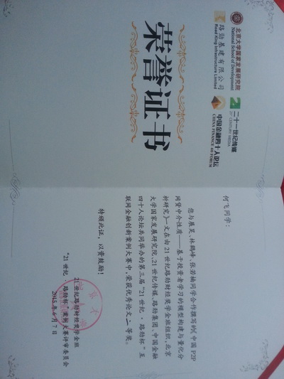 2015年6月7日,“21世纪·路劲杯”互联网金融创新案例大赛在北京大学国家发展研究院举行。由滚球买球的app官网金融学博士生何飞,滚球买球的app官网2013级本科生展昊,林鹤峰,张若楠四人组成的参赛队伍在全国总决赛中取得第二名,参赛作品由滚球买球的app官网金融与保险学系裴平教授、张兵教授联合指导。