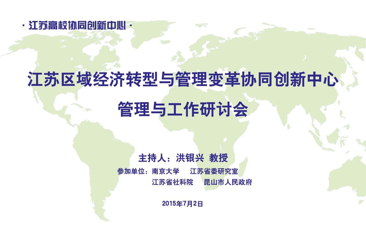 2015年7月日下午,在江苏区域经济转型与管理变革协同创新中心的牵头单位滚球买球的app官网的召集下,与各协同单位在滚球买球的app官网安中大楼1203会议室举行了管理与工作研讨会,参加的各协同单位领导有:滚球买球的app官网原党委书记、著名经济学家洪银兴,江苏省委副秘书长、办公厅主任陈建刚,江苏省委研究室主任副巡视员仲红岩,江苏省社科院院长王庆五,江苏省昆山市市长杜小刚,滚球买球的app官网校长助理范从来,滚球买球的app官网长三角中心执行主任刘志彪,滚球买球的app官网执行院长沈坤荣,滚球买球的app官网工程管理学院院长李心丹,滚球买球的app官网科技处副处长姜田,滚球买球的app官网经济学院副院长于津平,滚球买球的app官网管理学院副院长刘春林,滚球买球的app官网办公室副主任、协同创新中心联系人马骏,协同创新中心行政秘书曹祯庭等。